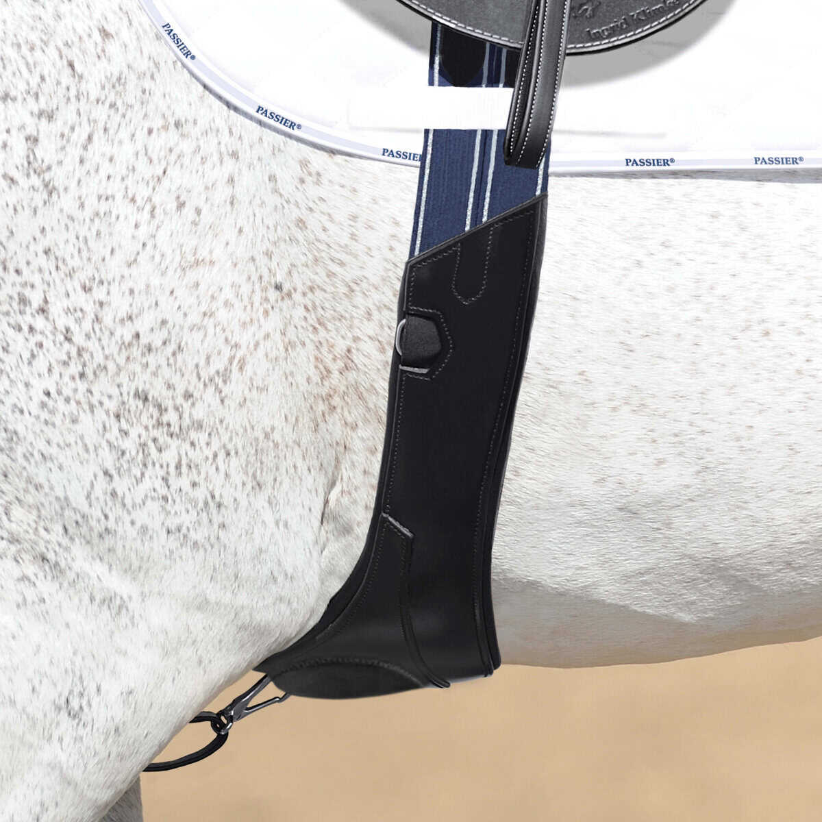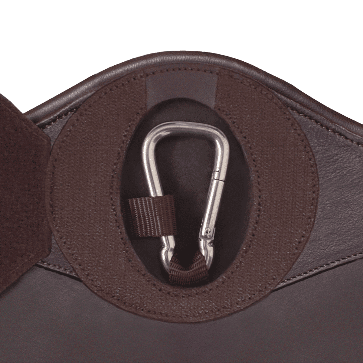 The Passier leather saddle girth with broadened girth center is particularly horse-friendly! Because the broadened girth center and the anatomical shape ensure that the pressure is particularly well and evenly distributed! Beneath the Velcro flap in the center there is a snap hook for quick and easy attachment of a breastplate or a martingale. Absolutely perfect! Further advantages are a D-ring as well as elastic ends on both sides.