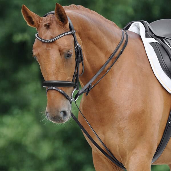 Elegant draw reins with practical loops and snap hooks at both ends for easy fastening.